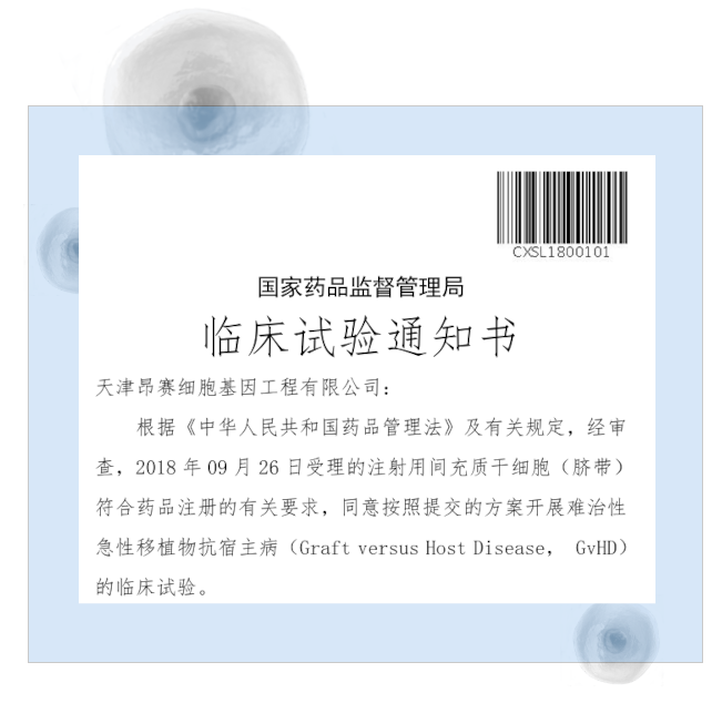2025年11月3日, 天津昂賽細(xì)胞基因工程有限公司申報(bào)的注射用間充質(zhì)干細(xì)胞(臍帶)治療難治性急性移植物抗宿主?。╝GvHD)兒童患者的適應(yīng)癥獲得國(guó)家藥品監(jiān)督管理局臨床試驗(yàn)?zāi)驹S可